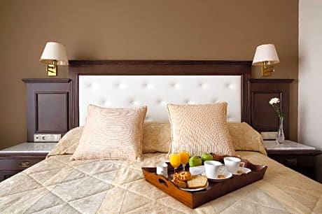 Elegantly decorated room in warm tones featuring air conditioning, TV, mini fridge and private balcony with garden or city views.