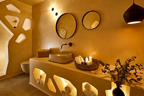 This charming hotel is located in Pyrgos. AEON SUITES guarantees a quiet stay as it counts with just 6 rooms. An all-suites hotel, where the simplicity of luxury highlights tradition, within a tranquil location. Aeon Suites offers amazing and unobstructed Aegean Sea view towards the east part of Santorini island and a memorable sunrise. Floating on the cliff of the hill overlooking the Aegean Sea, the hotel is situated just 500 meters from the main square of Pyrgos village on the edge of the medieval castle. Built with a modern interior offering all modern facilities Aeon Suites hotel offers 6 spacious suites, all with either an outdoor private heated hot tub or heated plunge pool.