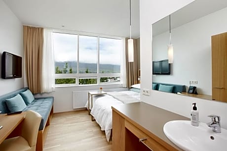 Located in Akureyri, this hotel offers fresh rooms with a TV and seating area. Facilities include a restaurant and a lounge bar. Hlídarfjall Ski Resort is 3.1 mi away. All rooms at Berjaya Akureyri Hotel feature modern décor and wooden floors. Tea and coffee facilities are provided in each room. The ground-floor restaurant offers breakfast and lunch, while dinner dishes mix Icelandic and Mediterranean influences. The Lounge Bar features a fireplace, drinks and daily afternoon tea. The hotel offers a 24-hour reception. Akureyri Swimming Pool, with its geothermal hot tubs, is a 2-minute walk away. Jadarsvollur Golf Course is 1.6 mi away.