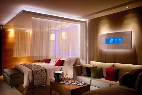Extras that come with the suite include: -VIP privileges check-in & check-out in the private reception -Complimentary sparkling wine and a fruit basket upon arrival -American buffet breakfast in an exclusive private area -Internet TV with a wireless keyboard -Electronically controlled curtains & lighting -Electronically controlled “Do not disturb” & “Make my room” signs -Bvlgari cosmetics -Pillow menu