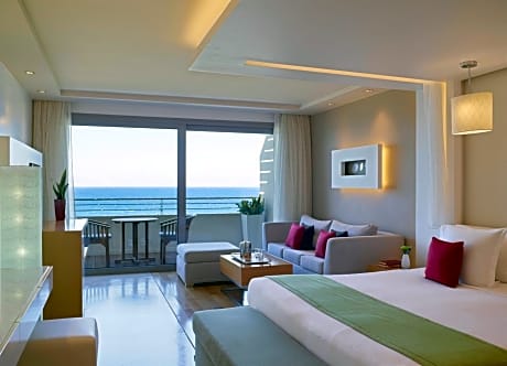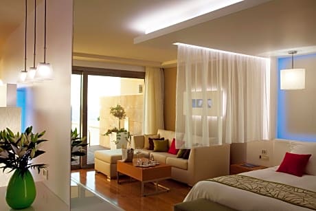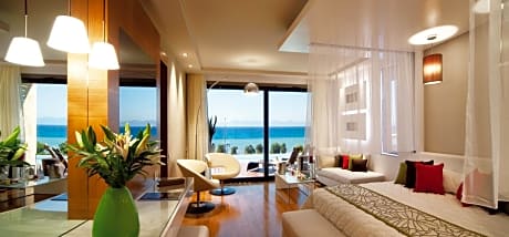 This suite features a private terrace from where guests can enjoy uninterrupted views of the Aegean. It is fitted with a mini-bar stocked with premium brands (available at a surcharge), complimentary Wi-Fi, a large flat-screen TV, and a NESPRESSO machine. The suite is complete with an private bathroom with a bathtub and separate shower. The property provides bathrobes and bath amenities.