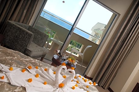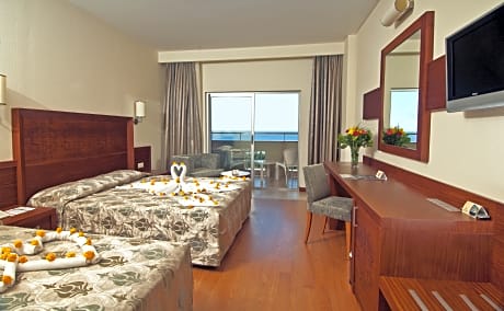 The 50, 000 m2 club resort is located 10 km to the east of Manavgat at the popular tourism centre of Kizilot Manavgat and close to ancient cities like Side, Aspendos and Perge. Antalya Airport is 80 km away, the private beach can be easily reached on foot. The hotel offers 475 rooms, 24-hour reception, currency exchange, free WIFI in public areas, meeting rooms, 5 restaurants, 6 bars, outdoor and indoor pools, children's pool, fitness centre, spa and wellness, bicycle rental, car hire and free on-site parking (reservation needed). Wheelchair accessible.