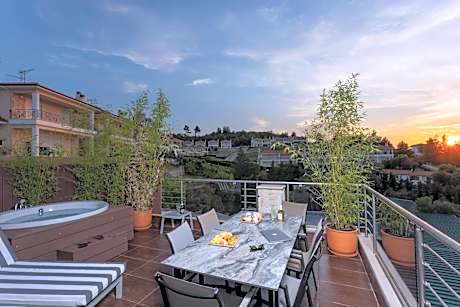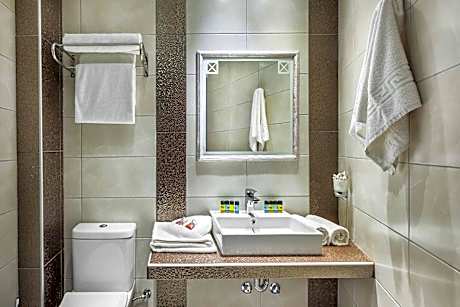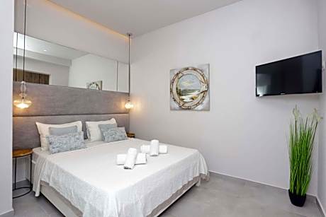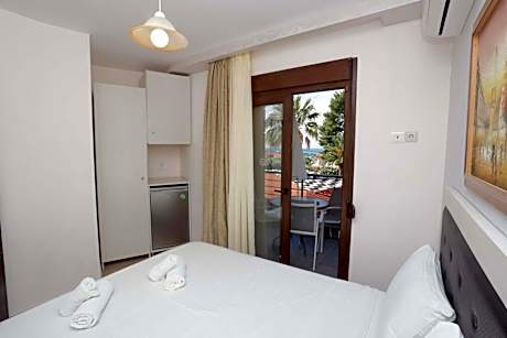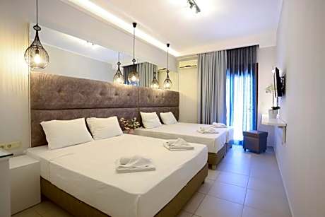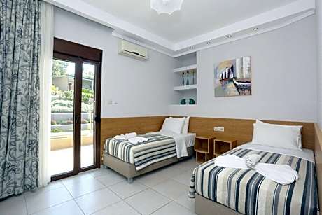 Surrounded by a palm-tree garden, Anna Maria Paradise features a pool with sun terrace and a bar-restaurant within 820 feet from Pefkochori Beach in Kassandra. Its self-catering accommodations has a balcony or patio with views over the Aegean Sea, the pool or the garden. Modernly decorated with lively colors and dark furnishings, the air-conditioned studios of Anna Maria include a kitchenette. A fridge, cooking hobs and an LCD satellite TV are available. The private bathroom comes with a shower and a hairdryer. A rich breakfast is served daily at the dining area. Guests can also enjoy a variety of Mediterranean flavors and refreshing drinks at the pool bar or at the a-la-carte restaurant Giraia Elia for lunch or dinner. Anna Maria Paradise lies within 0.9 mi from the center of Pefkochori and 14 mi from the center of Kassandra. Thessaloniki International Airport is at 77 mi. Free Wi-Fi access is provided in the public areas and free parking is possible on site. License Number(s): 122476857000