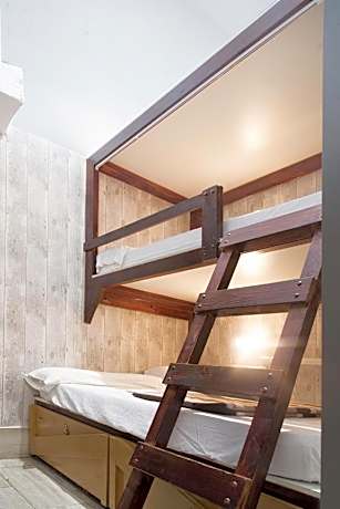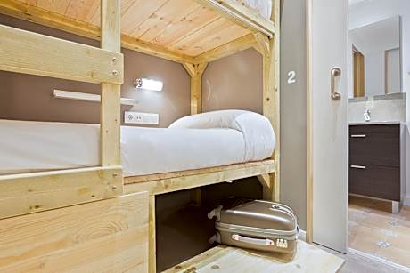 4-bed dormitory room which has 2 sets of bunk beds and a private bathroom. It features storage space below the bunks for suitcases and personal belongings.
