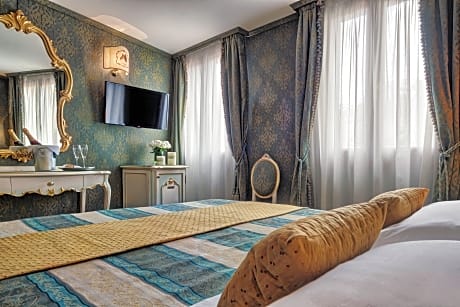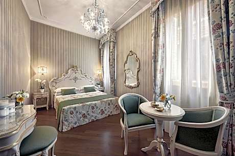 Room with attached bathroom with elegant, Venetian-style furnishings. Offers free Wi-Fi, air conditioning, and a satellite TV.