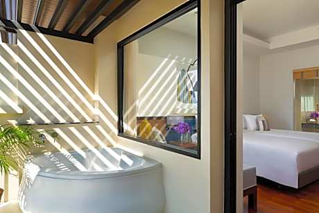 Located in the front building, spacious room that includes a private balcony with seating area, a satellite TV, tea/coffee making facilities and mini-bar. The private bathroom has a rain shower, slippers and bathrobes. A beach bag with beach mat and slippers are provided.