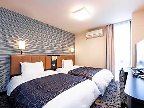 Simply furnished room with an private bathroom, a fridge and a desk. An electrc kettle with green tea is provided, and video-on-demand movies are available for purchase. All rooms are air-conditioned.