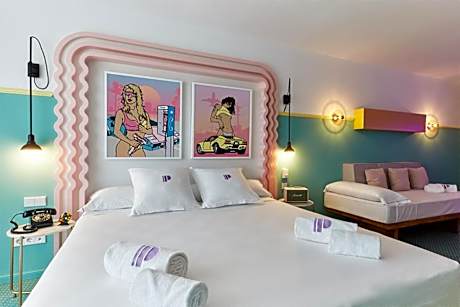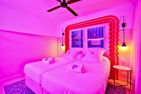 Located 1.2 mi from Ocean Beach Ibiza, Paradiso Ibiza Art Hotel - Adults Only offers two outdoor pool, an Art Gallery inside the property and free WiFi. There is free private parking on site. Featuring bright 70's-style furniture, Each room is named after an international contemporary artist and feature an original work of art donated by the artist. Each room comes with a Smeg fridge and Marshall speakers. They all include a balcony, air conditioning, and a private bathroom. Pool towels are provided. A buffet breakfast can be enjoyed in the breakfast area located by the pink pool. Paradiso Ibiza Art Hotel - Adults Only also features a tattoo studio and many more surprises. Ibiza Airport is 8.1 mi from the accommodations and a 25-minute drive will take you to Ibiza Town. When you book at this hotel you will have free access to the pool areas of the other Concept Hotel Group hotels.