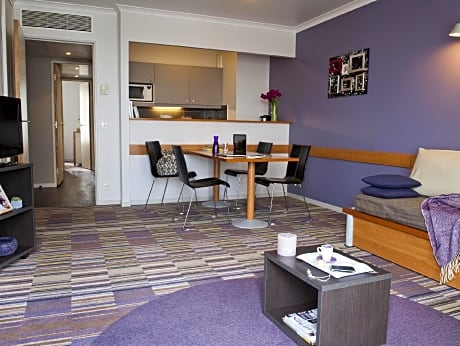 Aparthotel Adagio La Défense Kléber sits within a 10-minute walk from the commercial and business district of La Défense, on the southside of Courbevoie. It offers air-conditioned studios and apartments from 2 to 6 people. The U Arena is 1 mi from the property. This aparthotel offers apartments with a terrace or balcony, in a modern and attractive building. Each accommodations has a full equipped kitchen with a microwave, a stove and a fridge. They also include a tour desk and a safety deposit box. A dry cleaning, laundry and ironing service are possible at an extra cost. A breakfast buffet including sweet and savory ingredients and a selection of drinks is available every morning. This eco-friendly property also has a 24-hour reception, free fiber-optic internet in all areas and a private car park on site, available at a surcharge. Free baby kits are available. The public transport links located nearby provide direct access to the Champs-Élysées, with its luxury boutiques, in only 10 minutes. For stays up to 7 nights, optional housekeeping service is available upon request : at an additional cost, guests can request their bed linen and towels to be changed or a full housekeeping service. For stay of 8 nights and more, weekly housekeeping is provided and included in the rates