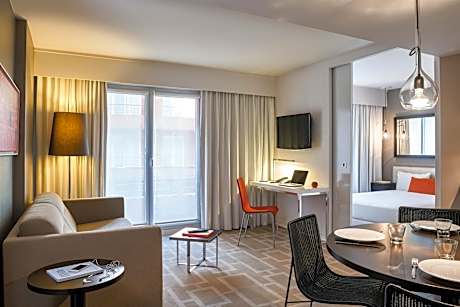 Located 5 minutes' walk from Acropolis Palais des Expositions and Acropolis tram stops in Nice, Adagio Nice Center offers self-catering apartments with sun terrace,a fitness center. The property is 1.2 mi from the Promenade des Anglais. Free WiFi is available. Each air-conditioned soundproofed studio or suite features a fully equipped kitchenette with a refrigerator, oven, electric kettle, dishwasher and kitchenware. They offer a living room with a flat-screen TV with satellite channels, a safety deposit box and a private bathroom. A buffet breakfast is served daily in the dining room. There is a 24-hour front desk and a laundry service for an additional cost. Adagio Nice Center is a 5-minute walk from Nice-Riquier Train Station and Nice's Old Town is 0.9 mi away. Private parking is available for an additional cost.