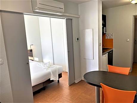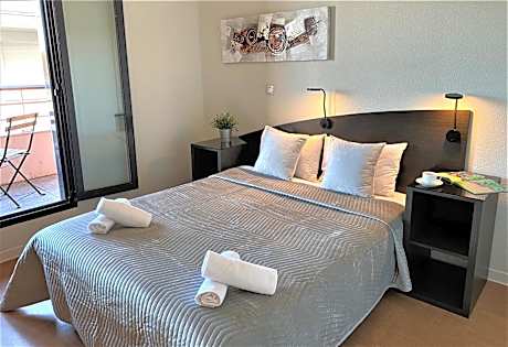 Enjoy a comfortable stay at Apart’Hotel Sainte-Marthe and feel right at home. We offer double, triple, quadruple, and six-person rooms with air conditioning, equipped kitchenettes, bathrooms, TVs, and high-speed Wi-Fi. The icing on the cake: some rooms have private balconies and facilities adapted for people with reduced mobility. The residence is open all year round and is ideally located close to transport links and a stone's throw from the historic center of Avignon. The continental buffet breakfast is popular with our guests and is served from 7:30 a.m. to 10:00 a.m. every morning. Our advantages: • Location • Private and secure parking (additional charge – electric charging stations available) or public parking a 5-minute walk away • Continental breakfast buffet (additional charge) • Terrace with unique views of the Palais des Papes, the ramparts, and the university • Private balcony for some rooms • Fully equipped kitchenette (dishes, hotplates, refrigerator, microwave) • High-speed Wi-Fi • TV • Bathrooms • Air-conditioned gym (free) • Rooms accessible to people with reduced mobility • Laundromat on the ground floor • Supermarket at the foot of the residence • Restaurants nearby • Secure bike storage on the ground floor • Bus stops and free Orizo shuttle in front of the residence