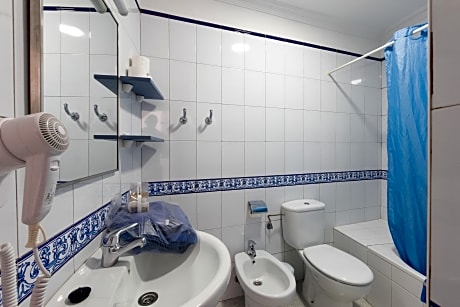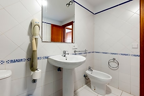 Standard Pool View or Solarium Apartment Located on a middle or top floor, with stair access only (no lift). In some cases, guests may be assigned an apartment on the top floor of Block 3 or 4, which are also Sea View Apartments. It features a balcony, kitchen equipped with a microwave, ceramic hob, fridge, toaster, coffee maker, and kettle. The bathroom has a bathtub or shower and a hairdryer. The living room includes a sofa bed and satellite TV. The bedroom has 2 single beds.