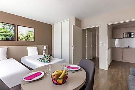 Appart'City Confort Rennes - Cesson Sévigné is located in Cesson-Sévigné, on the outskirts of Rennes, and offers self-catering accommodations. Free WiFi access is available throughout this Green Key-awarded property. Apartments at Appart'City Confort Rennes - Cesson Sévigné feature a flat-screen TV. Each accommodations comes with a private bathroom with either a bath or shower and a hairdryer. You can prepare meals using the apartment’s kitchenette, which is equipped with a microwave and a refrigerator. An all-you-can-eat buffet breakfast is available each morning, with an extra cost. Breakfast is composed of various breads, including gluten-free bread. AOC Poitou-Charentes products such as butter and croissants are also provided. Fresh fruit and fruit salad, as well as cheeses are offered. Guests can also enjoy organic yogurt and a large variety of organic tea. At Appart'City Confort Rennes - Cesson Sévigné you will find a laundry room. A private car park and a covered garage are available on site with an additional cost. Rennes–Saint-Jacques Airport is located 6.2 mi from the property.