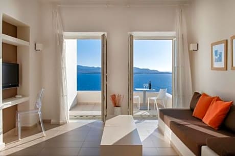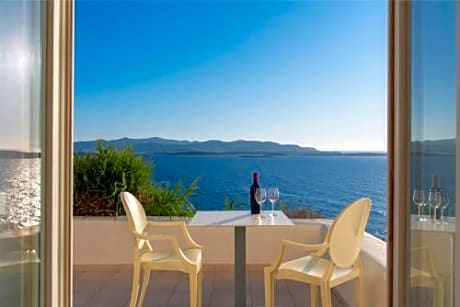 These upper-level sea-view suites have a split level bedroom, a living room with a sofa bed and a kitchenette, safety box, as well as a dining area. They can accommodate up to 3 adults or 2 adults and 2 children. Please note that this room type can accommodate 2 children up to 12 years old. Children up to 6 years old stay free of charge, while children from 6 to 12 years old can be accommodated upon charge.