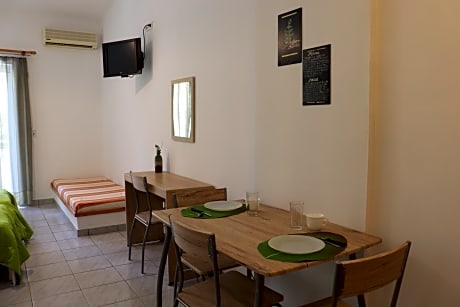 Apartment is 484 square feet and includes either bunk beds or 2 single beds 80-130 width plus balcony, cable tv, hairdryer, and safe.