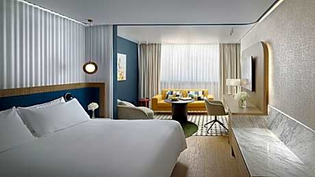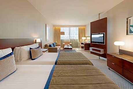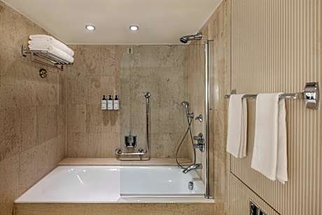 The elegant rooms at InterContinental Athenaeum Athens are designed for comfort, featuring marble bathrooms, seating areas, and soft-colored decor. Each room is equipped with a 32’’ LCD satellite TV, work desk, and coffee maker. Bathrooms come with luxury toiletries, bathrobes, and a scale. Some rooms also offer views of the Acropolis and feature artwork by Greek artists.