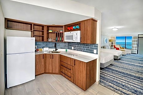 Each room boasts a private balcony overlooking the ocean, providing a peaceful backdrop for your stay. Rooms are vibrant and well-appointed with modern amenities including free Wi-Fi access, cable TV, and fully equipped kitchens. Start your day with a complimentary continental breakfast and enjoy a friendly manager's reception featuring free cocktails, beer, and wine.