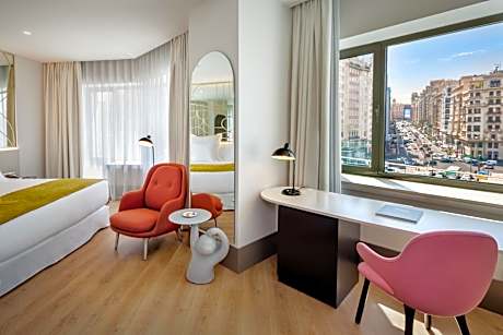 Set in Madrid’s Plaza de España Square, Barceló Torre Madrid offers elegant rooms with free WiFi, an indoor pool and on-site restaurant. Plaza de España Metro Station is right beside the hotel. Modern, spacious rooms come with large king-size beds, air conditioning, a 42-inch TV and a laptop safe. Their private bathroom comes with a rain-effect shower and hairdryer. As well as an indoor pool, you will find a fitness center, sauna and therapy rooms for massages. Barceló Torre Madrid’s restaurant offers á la carte meals. Guests can also enjoy a bar with a DJ. Meeting rooms are also available and reception is open 24 hours a day. Located beside Madrid’s Gran Vía, the hotel is near to many of the city’s theaters. The Royal Palace can be reached in a 10-minute walk, while both Puerta del Sol and Plaza Mayor Square are 15 minutes away on foot.