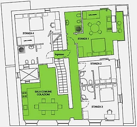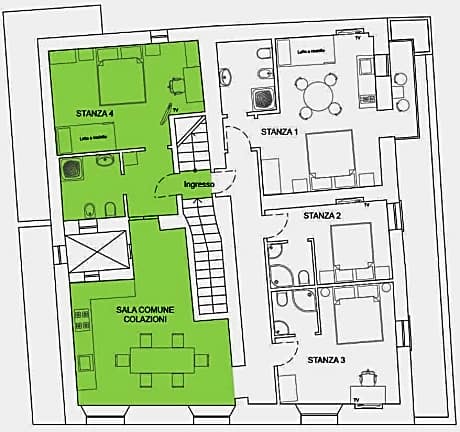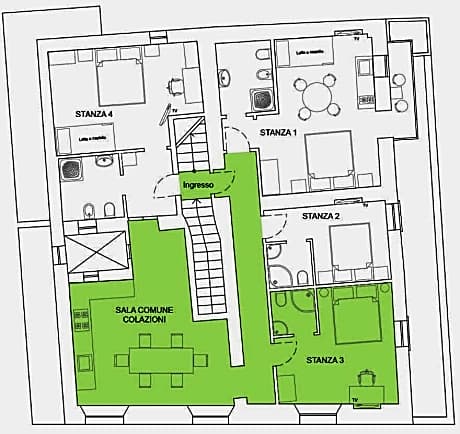 The room is served by a private and exclusive entrance to the structure; this in favor of maximum privacy. It is equipped with a private bathroom and every comfort: personal fridge, TV, safe, WI-FI internet, set of towels, courtesy set (bar of soap, shower-shampoo, shower cap), hairdryer.