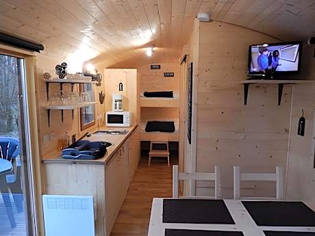 Wooden caravan including a seating area with a flat-screen TV and a DVD player. It also has a well-equipped kitchen with a coffee machine.