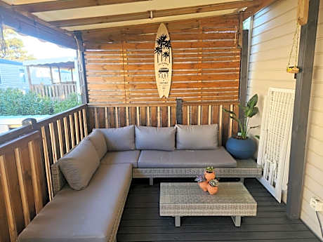 This air-conditioned mobile home includes 1 living room, 3 separate bedrooms and 1 bathroom with a shower. Guests will find a stovetop, a refrigerator, a dishwasher and kitchenware in the kitchen. The mobile home also features a barbecue. Boasting a terrace with mountain views, this mobile home also offers a washing machine and a flat-screen TV. The unit has 6 beds.