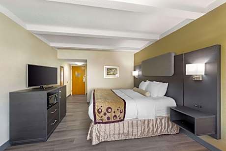 This room features a microwave, small refrigerator, and a flat-screen cable TV.