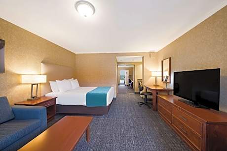 Located on the exterior lower level, this room offers free WiFi and a 37" LCD TV with pay-per-view channels. Additional amenities include a refrigerator, microwave, ceramic cooktop, dishes, utensils, and coffee machine.