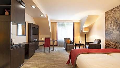 Bilderberg Hotel De Bovenste Molen is located in a green forest area nearby the city of Venlo. Enjoy the beautiful location, the multitude of wellness facilities and park your car for free. Have a swim in the indoor pool or unwind in the sauna, solarium and Turkish steam bath. Sporty guests can play golf at 1 of the golf courses in the area. The hotel rooms are stylishly decorated and have a private bathroom. Bilderberg offers a healty breakfast buffet each morning. It includes artisan breads, organic dairy, fruits and various juices. Restaurant WOODZ has an inspiring menu with various specialties and fresh ingredients. You can also visit Lounge Bar Mills to have a drink and relax. The garden terrace is available for sunny weather. Around Bilderberg Hotel De Bovenste Molen you can go cycling or walking. Düsseldorf and Maastricht are easily reachable by car. Explore these cities with their exclusive boutiques and charming terraces.