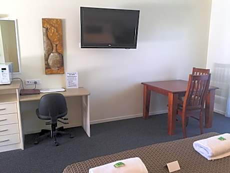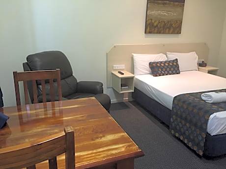 This spacious room features a full kitchen with a full-sized fridge, cook top, microwave and tea/coffee making facilities. Also provided is a leather recliner, a large Smart TV and a private courtyard. There is a 2-person dining setting, a work desk and air conditioning. Guests have access to the pool and BBQ area.