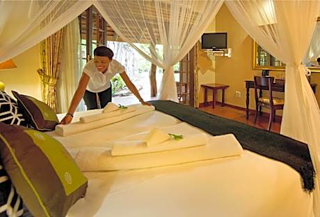This lodge is nestled between the Drakensberg Mountains and the Blyde River. It features elegantly decorated rooms that open onto tranquil gardens, where zebras and wildebeests wander by. At the entrance of the Blyde River Canyon Nature Reserve, the Blyde River Canyon Lodge features air-conditioned rooms decorated with wood furniture. Each room has a satellite TV and an electric teakettle. An English breakfast is served daily, and the guesthouse’s restaurant provides local dishes for lunch and dinner upon request. Special diet menus are also available. Guests can relax by the outdoor pool or enjoy massage treatments. They can also choose from a variety of activities in the surrounding area, including hot air balloon rides, rafting, horseback riding and hiking. The Kruger National Park's Orpen Gate is a 40-minute drive away, and free public parking is available on site at the lodge.
