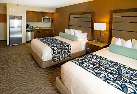 Accommodations at Boardwalk Resorts - Flagship feature spacious studios and suites with 42-inch flat-screen TVs, separate living and dining areas, and kitchenettes. Guests can enjoy spectacular views of Atlantic City, the beach, and the ocean from their rooms. The on-site fitness center and game room offer additional entertainment options for guests of all ages.