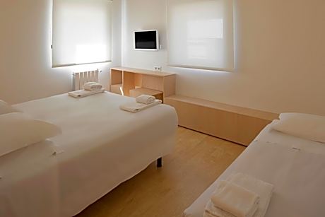 This room features a cable TV and is brightly decorated with large windows. It includes a modern private bathroom and some rooms have a balcony.