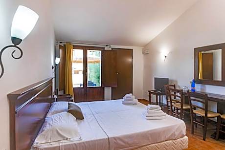 Decorated in a characteristic Tuscan style and featuring dark-wood furnishings, this room with attached bathroom offers air conditioning, a fridge, and a TV.