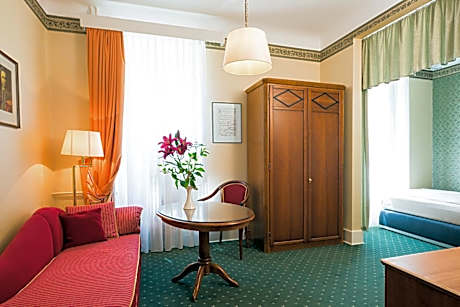 Classic-style room features a single bed (47 in in width,) a flat-screen TV, a work desk and a seating area. Some of the roomes have a view of the quiet garden.