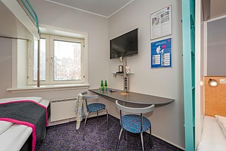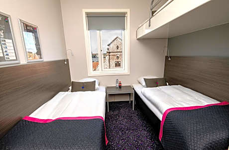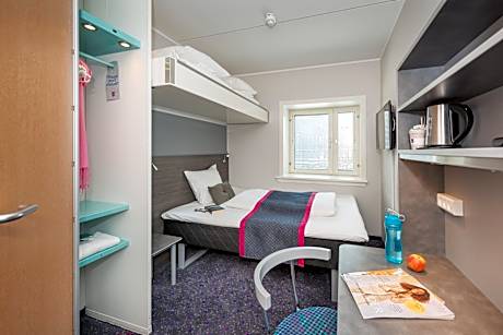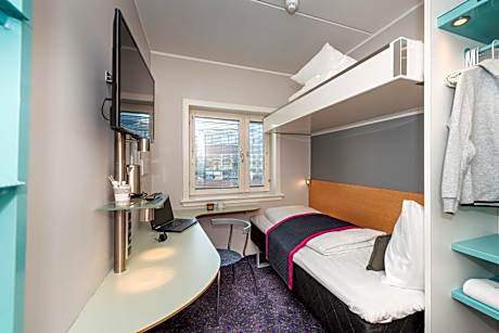 In Odense, right next to the central station, is Cabinn Odense. It offers a 24-hour front desk and rooms with a TV, work desk and free Wi-Fi. All rooms at Odense Cabinn have private bathrooms with a shower and an electric kettle with free tea and coffee. The rooms are inspired by cabins of passenger ships, putting limited space to maximum use. Breakfast is offered on the upper floor with views of the city. Snacks and beverages are available in the reception. The H.C. Andersen Museum is located just over a quarter mile away. The Odense Zoo is a 12-minute drive from the hotel.