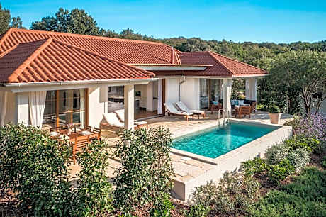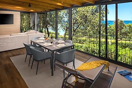 Mon Perin Camping Resort is located by the sea, with 5.9 mi of coastline. It covers an area of 1312 ft² and is surrounded by untouched natural scenery. Accommodations options range from cozy camping homes and villas to luxurious glamping villas with private pools or hot tubs. All types of accommodations include air-conditioned spaces, a fully equipped kitchen and dining area, a comfortable living room with a flat-screen TV and satellite channels, as well as a bathroom with a shower and complimentary toiletries. A carefree vacation is ensured with free Wi-Fi and complimentary parking spaces. The camping resort is an ideal destination for nature lovers, adventure seekers, food enthusiasts and those who appreciate true relaxation Guests have access to Palo Water Park with a dinosaur shaped pool, Fresh Market & Farm, inflatable aqua park, outdoor cinema on the beach and free panoramic train ride through the camp to Bale. The camp has a Wellness & Spa Center with indoor and outdoor heated seawater pools, 3 types of sauna, tropical shower, a salt room and relaxation room. For select accommodations units, access to the spa center comes at an additional fee. The spa center offers a range of cosmetic treatments and massages at extra cost. Inside the campground, guests can also enjoy various activities such as diving school, windsurfing, standup paddle boarding, and a multifunctional sports field, available for an additional charge. The romantic coastal town of Rovinj is just 12 mi away, while Pula Airport is 20 mi from the campground.