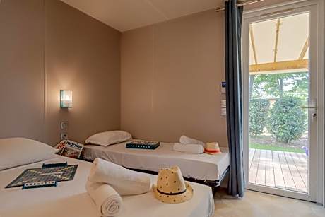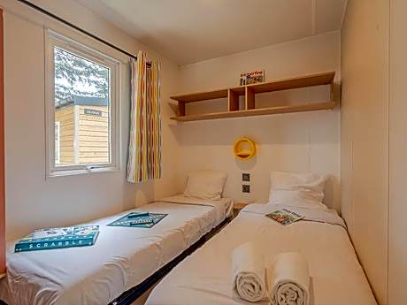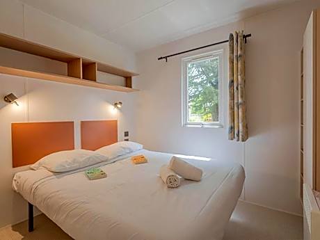 This mobile home consists of 1 living room, 2 separate bedrooms and 2 bathrooms with a walk-in shower. The fully equipped kitchen features a stovetop, a refrigerator, kitchenware and a microwave. A seating area with a TV, a coffee machine and a terrace are provided in this mobile home. The unit offers 3 beds.