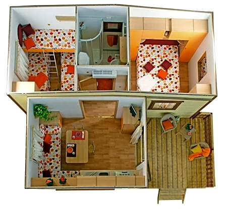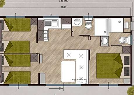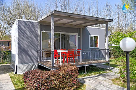 The mobile home features a terrace with table and chairs. It includes a kitchen with a microwave, and a living area with a sofa.