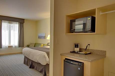 This room features a small refrigerator, a microwave and a coffee maker. It has 2 queen beds or 1 king bed and a sofa bed.