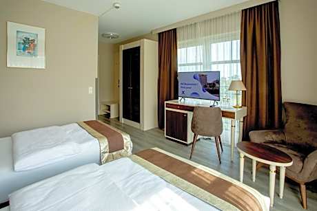 Only 5 mi from Frankfurt city center and 6.2 mi from the Frankfurt exhibition grounds, this hotel in Bad Vilbel offers wellness facilities with a sauna and steam bath, regional and international cuisine and soundproofed rooms. The City Hotel Frankfurt Bad Vilbel has nonsmoking rooms with satellite TV and a stylish bathroom with level-access shower. Some have a balcony providing great views of the Taunus Mountains. Guests staying at the City Hotel Bad Vilbel can relax in the small spa area with sauna, and steam room. Varied breakfast buffets are available in the Wintergarten restaurant. Seasonal dishes are served in Restaurant "Bei Freunden". The City Hotel’s Bar Mondial and Bamboo Lounge invite guests to relax with a drink. The countryside surrounding Bad Vilbel is perfect for activities including hiking, cycling, and golf.