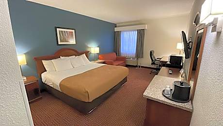 Located just 3 miles from Kalamazoo/Battle Creek International Airport, this hotel offers free airport shuttles, an indoor heated pool and sauna. Every room features Nintendo 64 video games. The spacious rooms at Clarion Inn I-94 near Expo Center provide free Wi-Fi and cable TV with pay-per-view movies. They have coffee-making facilities and a work desk. Guests can enjoy a continental breakfast that includes waffles, eggs and muffins. Clarion Inn I-94 near Expo Center also offers free daily newspaper and a business center. Located just off Interstate 94, this hotel is less than 15 minutes’ drive from Air Zoo Museum, Kalamazoo State Theater and Western Michigan University.