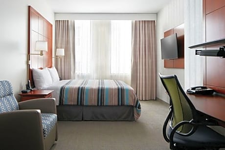 This suite features a separate seating area with a sofa, a microwave and refrigerator.