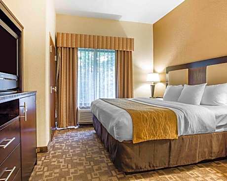 This Kennesaw, Georgia hotel features an indoor heated pool and a gym. Guest rooms provide free Wi-Fi and the hotel is less than one mile from Kennesaw State University. Each room at the Comfort Suites Kennesaw includes a flat-screen cable TV. The rooms are furnished with a microwave, a refrigerator and coffee facilities. A business center is available at the Kennesaw Comfort Suites and a hot breakfast is served every morning. Laundry facilities are also available for added convenience. The hotel is located off Interstate 75. Downtown Atlanta is 24.9-miles from the Comfort Suites Kennesaw.