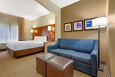 The Comfort Suites Regency Park hotel, next to WakeMed Cary Hospital is centrally located near two major business centers, Regency Park and McGregor Industrial Park. This Cary, NC hotel is just minutes from area attractions like Carter-Finley Stadium, Jordan Lake, the Time Warner Cable Music Pavilion at Walnut Creek and the RBC Center. North Carolina State University is only 10 miles away. The Raleigh-Durham International Airport is 12 miles from the hotel. Visitors can go shopping at the nearby Crabtree Valley Mall, Cary Towne Center Mall, Triangle Town Center and Cameron Village. Exploris and an IMAX theater are also nearby. A variety of restaurants and cocktail lounges are located in the surrounding area. O'Charley's Restaurant and Danny's Barbecue are within walking distance. Full-service hotel amenities and features include free wireless high-speed Internet access, free local calls, free weekday newspaper. Enjoy our free hot breakfast featuring eggs, meat, yogurt, fresh fruit, cereal and more, including your choice of hot waffle flavors. If you're leaving early, a Your Suite Success Grab & Go bag is available for the two hours prior to breakfast. Guests of this Cary, NC hotel will also enjoy the exercise room and indoor heated pool. Business travelers will appreciate conveniences like two-line telephones and access to copy and fax services. A meeting room is available to accommodate most events and business functions. This all-suite hotel features spacious guest rooms with 32-inch LCD high-definition televisions, refrigerators, microwaves, coffee makers, hair dryers, irons and ironing boards. Keep your electronic devices charged with the recharge device including AC and USB outlets provided in all guest rooms. There are junior and executive suites with up to 150 square feet of additional living space. All suites have been upgraded with pillow-top mattresses. Pets are welcome with a deposit and stay fee.
