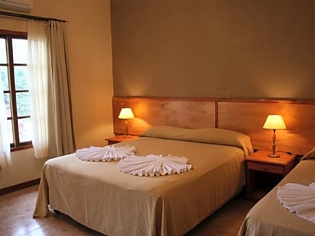 The hotel is located in the middle of a park which is 17 acres in size and surrounded by beautiful natural scenery. It is just 3 km from the city of Puerto Iguazu and 15 km from the Iguazu Falls. This resort offers comfortable rooms, bungalows and camping places. It is an excellent choice as guests can enjoy a relaxing holiday and appreciate the natural beauty of the area. The holiday village was renovated in 2011 and has a total of 85 rooms. The premises are air-conditioned and guests are welcomed in a lobby with 24-hour reception service. Facilities include a hotel safe, currency exchange, cloakroom and a newspaper stand. Guests can dine at the restaurant as well as use the barbecue grills and enjoy a drink at the café. There is also a games room and a TV lounge. Younger guests can let off steam in the kids' club and children's playground. Wireless Internet access is provided and guests can also take advantage of the room and laundry services on offer. Those arriving by car may leave their vehicle in the hotel's car park. The rooms have en suite bathrooms with a shower. Guests can enjoy a good night's rest on their double bed. Facilities include satellite/cable TV, a mini fridge, air conditioning and heating. The rooms are accessible for wheelchair users. Guests can take a refreshing dip in the two outdoor swimming pools. There is also a children's swimming area. Sun loungers and parasols are laid out for guests to enjoy. There is also a volleyball court. There is a wide variety of options for entertainment and leisure, including a sports field and more fun activities. The hotel serves a breakfast buffet and a dinner buffet.