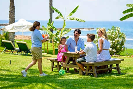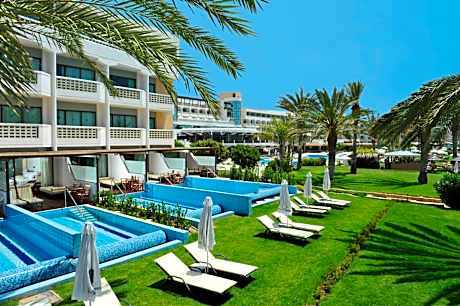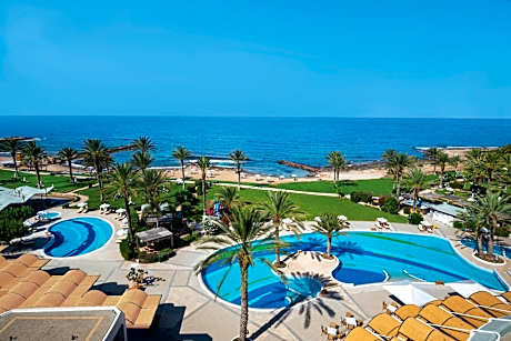 Athena Beach Hotel is beachfront hotel in Kato Paphos, within walking distance of the harbor, archaeological sites, shops and nightlife. It offers rooms with balconies and 3 outdoor swimming pools. The rooms at Athena Beach Resort have air conditioning (May-Oct), central heating (Nov-Apr), LCD satellite TV, safety deposit box and coffee/tea making facilities. Guests are provided with bathrobes. The rooms’ spacious balconies offer views over the Mediterranean or the hotel’s tranquil gardens. There are many leisure facilities at Athena Beach Hotel, such as tennis courts, a kids' club, paddling pools, outdoor and indoor bowling. The hotel features 3 freshwater swimming pools, 2 waterslides at the completely new Oasis Splash which includes a colorful splash pad with spray toys for our younger guests, a heated indoor pool. The hotel's spa features 2 saunas, 2 steam baths, a gym and a hairdressing salon. A range of professional massages and other treatments are available. High-speed wi-fi is available for Free throughout the entire hotel. Free private parking is available on site. The resort is located 9.3 mi from Paphos International Airport and 87 mi from Larnaca International Airport.