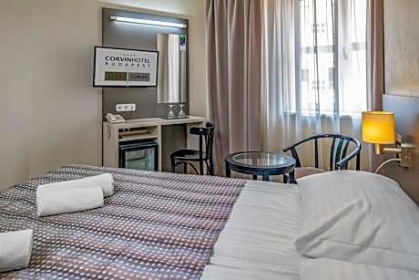Corvin Hotel Budapest Corvin Wing offers accommodations in Budapest. Some of the rooms come with a balcony, facing the garden or the quiet street. Each room has air conditioning and is equipped with a cable TV. Private bathrooms are fitted with a shower. Staff at the 24-hour hotel reception can provide tourist with tips or reserve bicycles. The on-site bar is open around the clock and guests can access free Wi-Fi connection in public areas. With an eye for dietary requirements, the restaurant serves buffet-style international dishes. Corvin Hotel Budapest Corvin Wing is set 1148 feet from Corvin Negyed metro station. Budapest Liszt Ferenc Airport is 11 mi away.