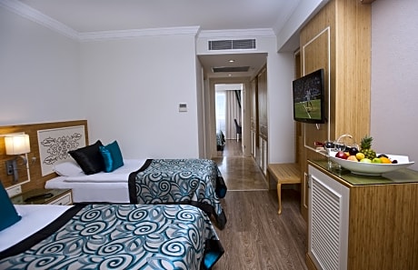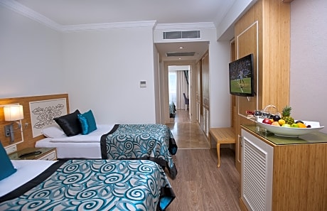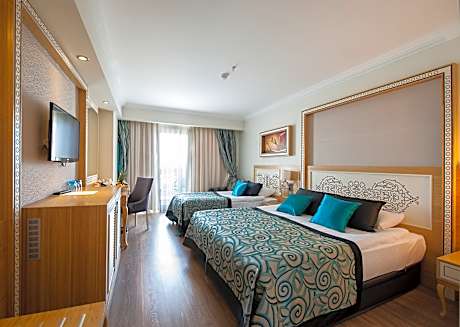 This resort hotel is located on the long coastline of Belek in an area known as Bogazkent. The hotel's own beach is a few metres through the hotel's grounds and public where guests may enjoy a sand and pebble beach. The city centre is 10 km away and Antalya Airport is 45 km away from the hotel. Public transport runs just in front of the hotel. A paradise for families with children, the hotel occupies 42, 000 m2 of land and consists of a number of low-rise modern designed blocks. All rooms are elegantly decorated, equipped with a satellite TV, air conditioning, a balcony and a private bathroom with toiletries. Furnished in an elegant and contemporary style, guests can relax at the swimming pools and excite with 7 different waterslides. Children guests can take an opportunity to free their minds with variety of activities at the mini club. On arrival guests will be welcomed with a traditional sweet and glass of sherbet.