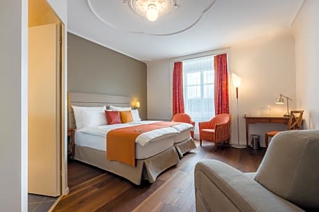 The 3-star Hotel DES ALPES is ideal for city travelers. It is located directly on the Reuss River in the picturesque, car-free old town of Lucerne right next to the world-famous Chapel Bridge. Sights, Culture and Congress Center Lucerne (KKL), train station and boat landing are within 3 minutes walking distance. Enjoy your stay in a room with a fantastic view of the lake, the Chapel Bridge and Mount Pilatus or with a view of the historic pedestrian zone of the Old Town. All rooms are well equipped, some have a balcony. Included in the overnight price is a value voucher of CHF 18.50, which you can use for any consumption in our restaurant directly on the Reuss river.