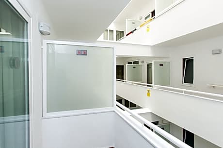 These rooms include a balcony with views of the interior courtyard, satellite TV, desk, and a bathroom with a hairdryer.